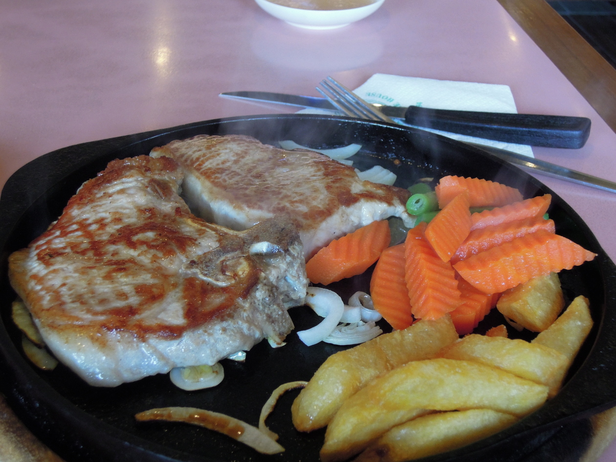 味付けはほとんどしてありません。テーブルに運ばれるソースや塩・こしょうで勝手にどうぞ、ということのようです。タイの洋食は味がくどかったり甘かったりするのでこれはありがたい。ポークチョップなどは肉のおいしさがあるので塩・こしょうで充分楽しめました。