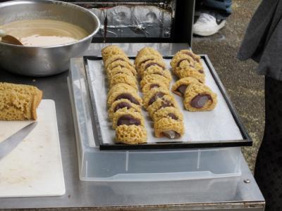ふんわりのワッフル生地で餡とお餅をくるんだ「ふくさ餅」を作りながら試食させてくれていました。どら焼きとは全く違う柔らかさでおいしかったです。