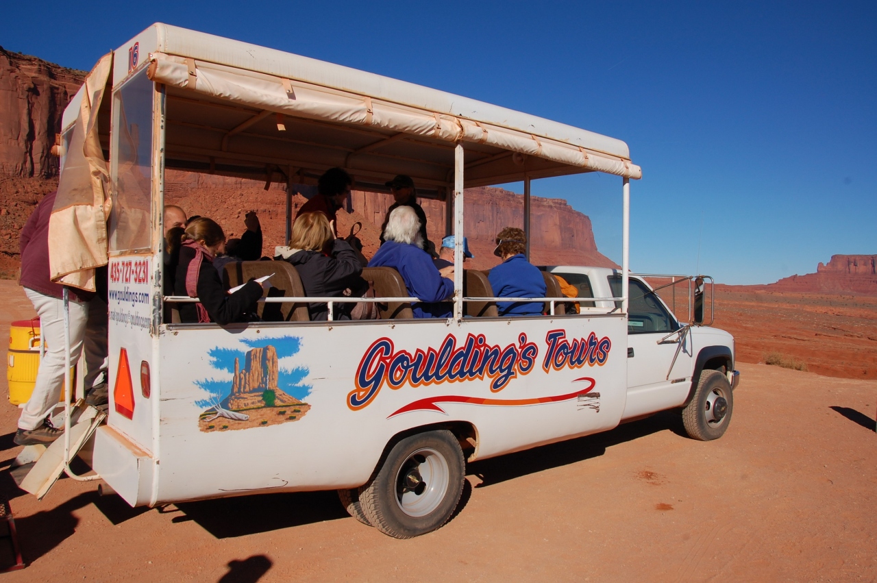 周辺にいくつもツアーを取り扱うところがありましたが、私たちはゴールディングス・ロッジから出発するツアーに参加しました。3時間半のツアーは一般車両立ち入り禁止のミステリーバレーの一部まで入ります。途中、各見所でストップして解説があったり、ネイティブアメリカンのおばあさんの家を訪問したりしました。