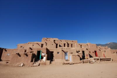 サンタフェから車で1時間半のタオス・プエブロは1000年以上の歴史がある建物に今もネイティブ・アメリカンが住みながら世界遺産に指定された集落です。