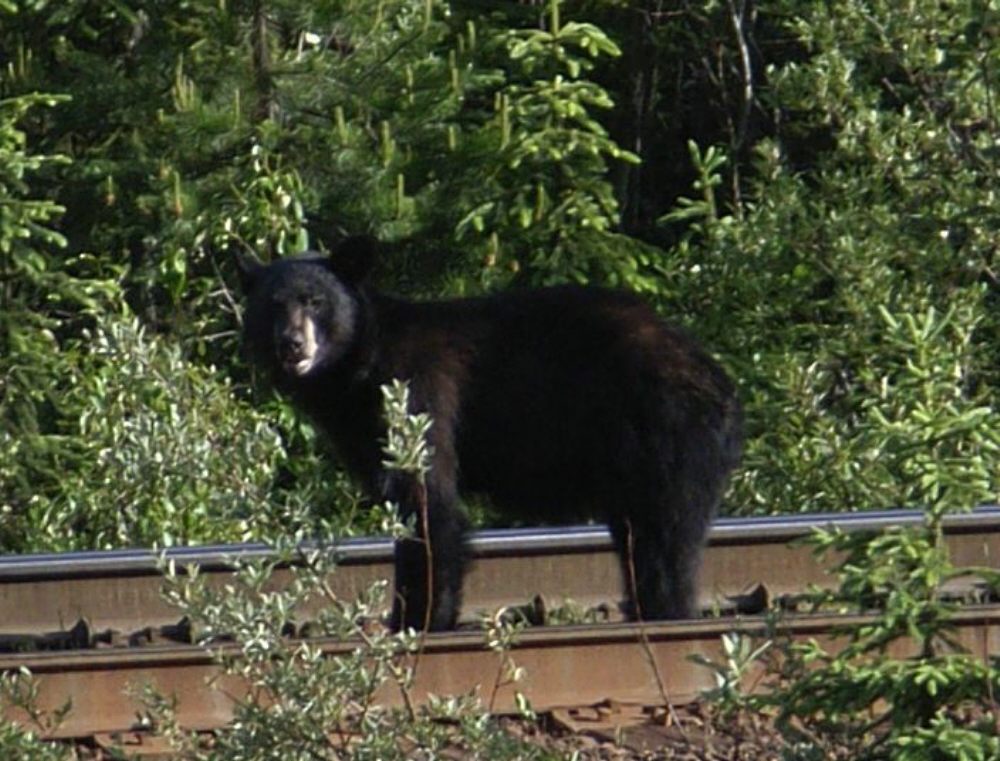 レイクルイーズからヨーホー国立公園に入ってすぐ、West Lake Lodge付近の岩壁ではよくマウンテンゴートが見られるそうです。私たちはマウンテンゴートは見れなかったのですが、向かいの線路の上に座るブラックベアの親子を見ました。
