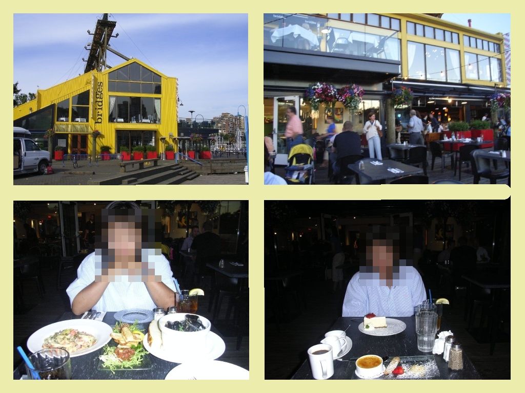 グランビル・アイランドのミニ・フェリー乗り場の隣にあるレストランです。屋内・屋外の席があり、私たちは屋外のデッキ席が取れました。対岸に夕暮れのバンクーバーのダウンタウンを眺めながら食事が出来る陽気なお店です。お客さんの大半は仕事帰りの地元の人のようです。