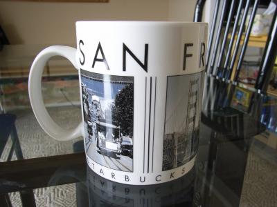 スターバックスでは、米国内で(大都市に限られますが)その土地の名所の写真や絵を入れたマグカップを販売しています。写真のものはサンフランシスコのものの1つで現在4シリーズあります。各店舗の器具やポットなどの棚においてあります。