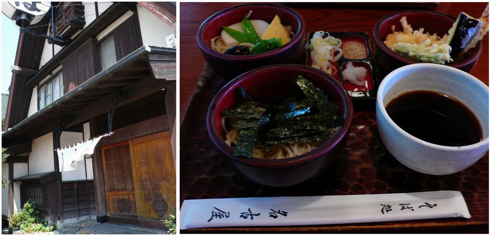 おそばはちょっと白め、つゆは濃くて甘めです。ざるそばはボリュームたっぷりの2段重ね、お勧めの大名そばは3つのお椀に天ぷらや湯で野菜などが盛られています。