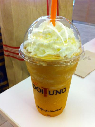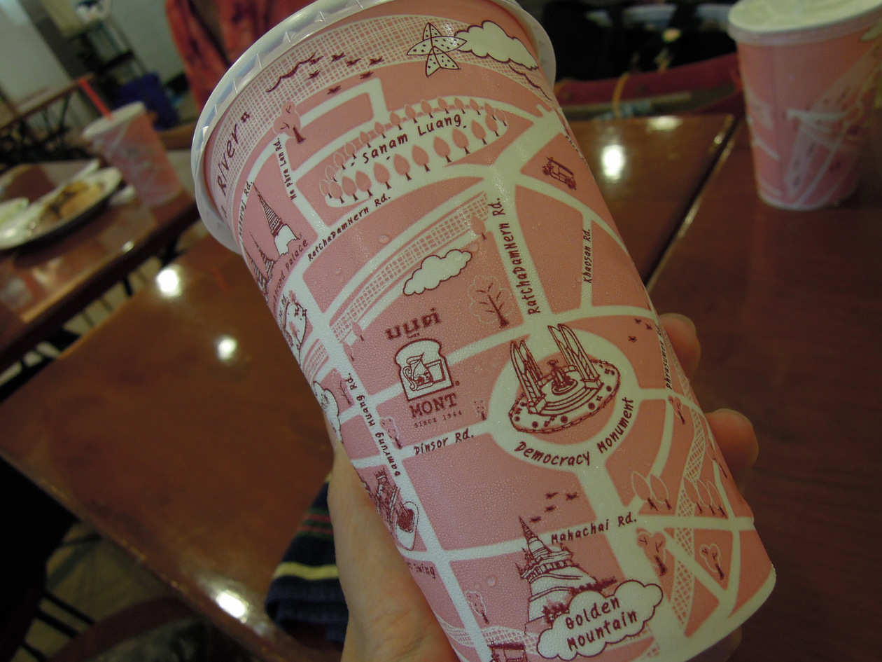 冷たいドリンクのカップには店周辺の民主記念塔辺りのかわいい地図イラストがプリントされています。- 旅行時期