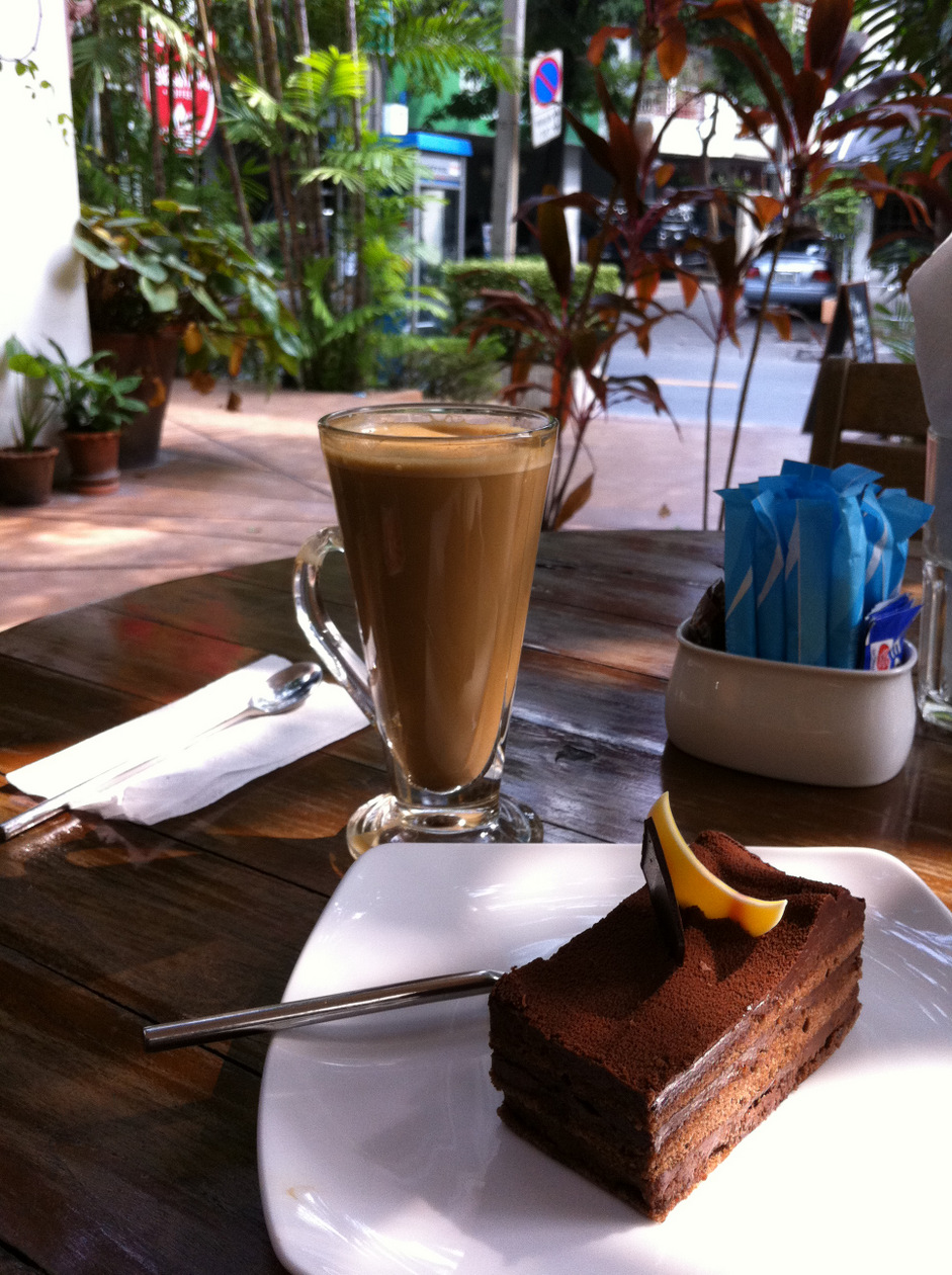 バンジャーク駅前にあるきれいなカフェです。内装がすてきでした。アイスコーヒーは香りがいいのですが、何も言わないとたっぷりの砂糖が入ってくるので注意。ケーキ類もタイ風の甘さですが、タイならではの種類でタイティーケーキやトロピカルフルーツのケーキがあります。ジムトンプソンアウトレットのそばですが、アウトレット内のカフェの他にもこんなところでお茶はいかがでしょうか。