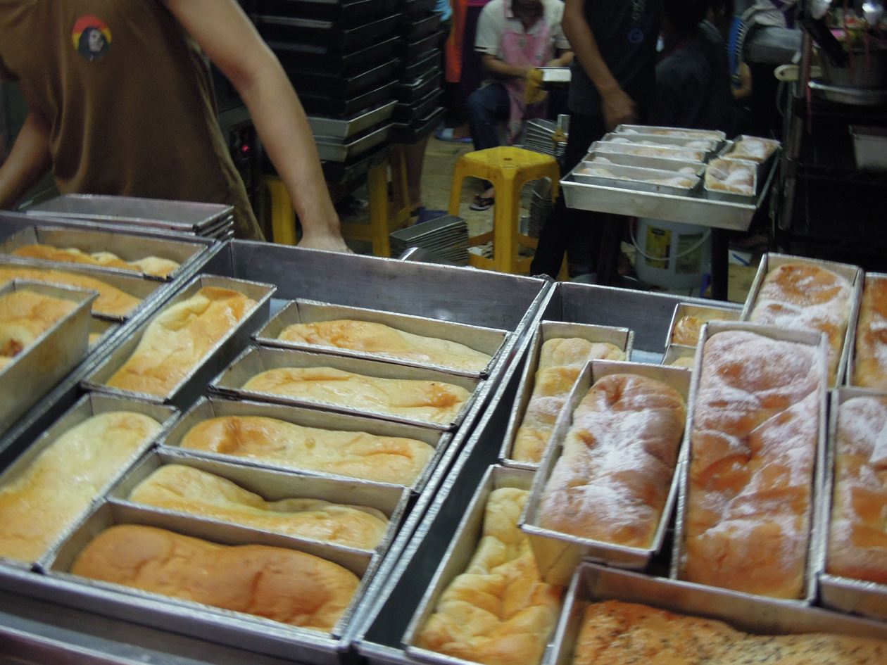 ワンラン船着場近くのパン屋さんです。焼き上がるとすぐに型ごと店先に出し、その場ですぐに飛ぶように売れていました。大人気の店のようで、お客さんはひとりで何斤もまとめ買いしていっています。