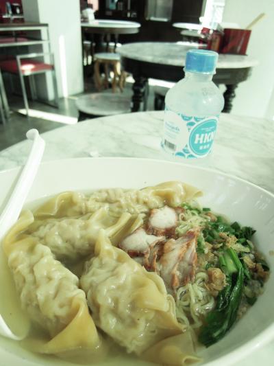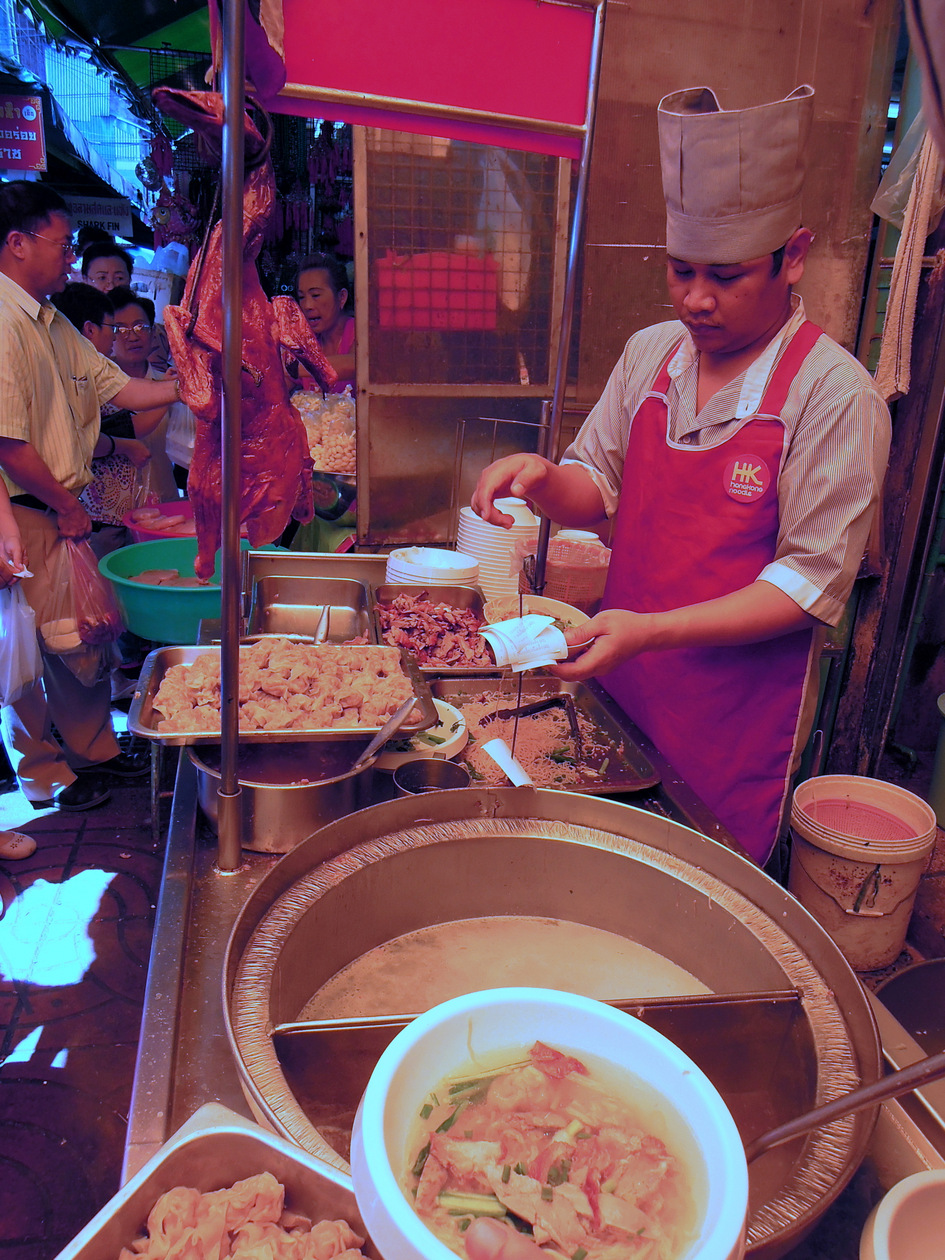 チャイナタウンにあるスープ麺がおいしい飲茶食堂です。場所はメインストリートのヤワラー通りから食料品店が並ぶ細い路地イサラーヌパーブ通り(Isaranuphap Rd.)の一番奥、ジャルンクルン通りに出る数軒手前です。目印は赤い看板と店先の大鍋で茹でているワンタン。