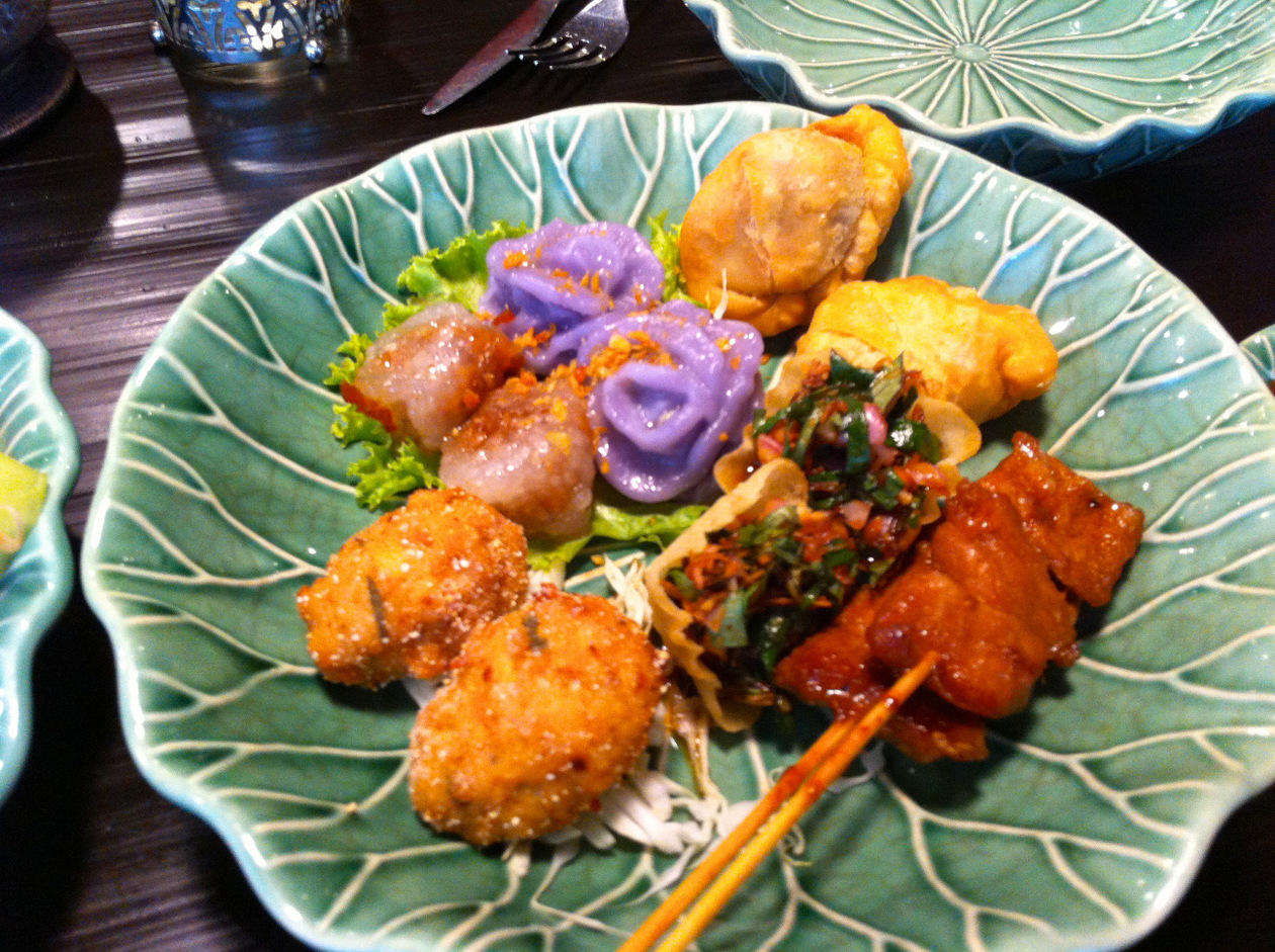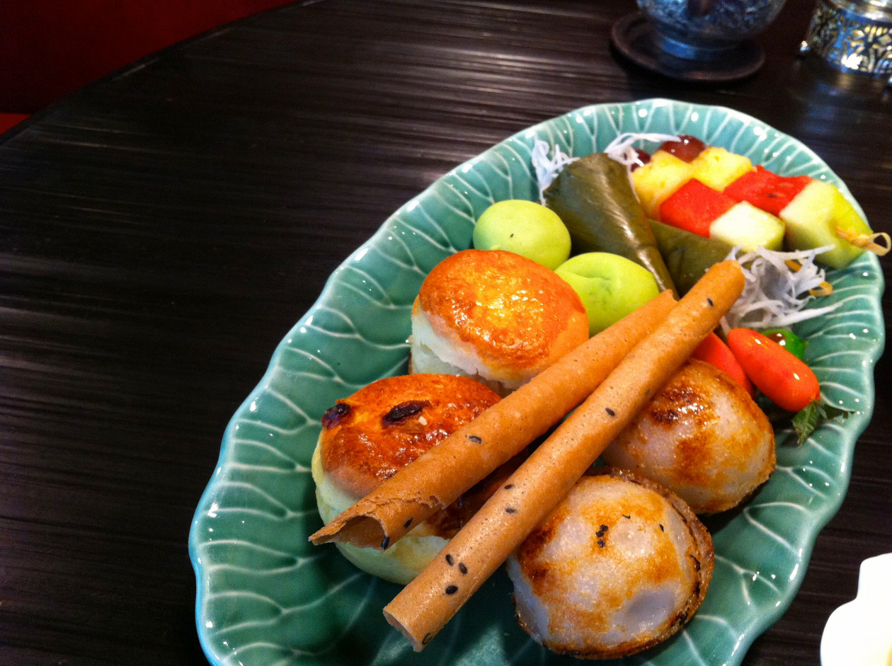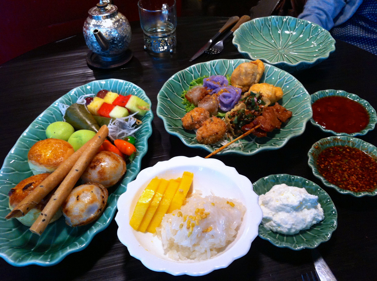 タイ料理のアフタヌーンティーが特徴で、午後のお茶というよりしっかりお腹がいっぱいになるお昼か夜の食事のようでした。辛さは控えめ。ピーナッツ味の餡をくるんだものが多く、タイ料理というよりインドネシアのような気もします。お茶にはちょっと強すぎる味。