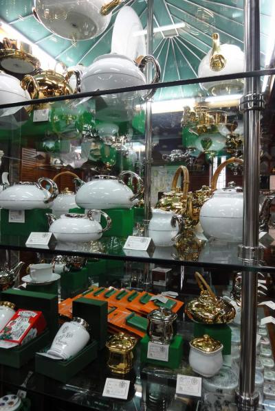 多くの展示品(それが気に入ればその場で買うこともできます)から好みの色や縁取りを金にするか、プラチナにするかなどを選んでオーダーします。名入れも出来ます。同じ柄、地色でも縁取りによって全く別のもののように仕上がります。