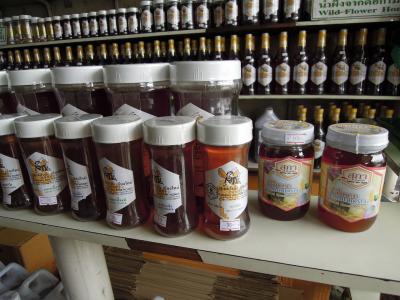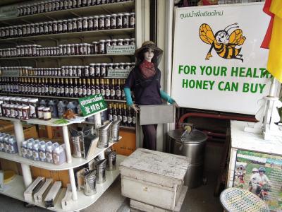 奥様が店番をしていらして、養蜂姿のご主人の写真パネルが飾ってある家族経営の店。後で調べたら北部タイの養蜂家団体の代表を長年務められていたようで、商品も真面目なものだと思います。