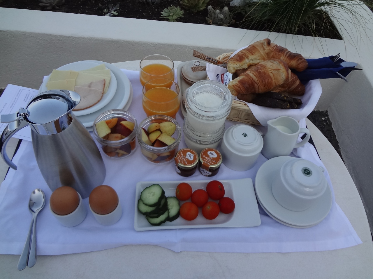 フィラの街と海が見え最高の景色です。朝食はその景色を見ながらゆっくり外でいただけます。