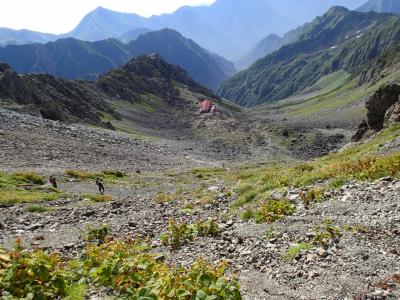 山荘の荷物を整理して、山荘の前に荷物をデポし、サブリュックのみの軽装...