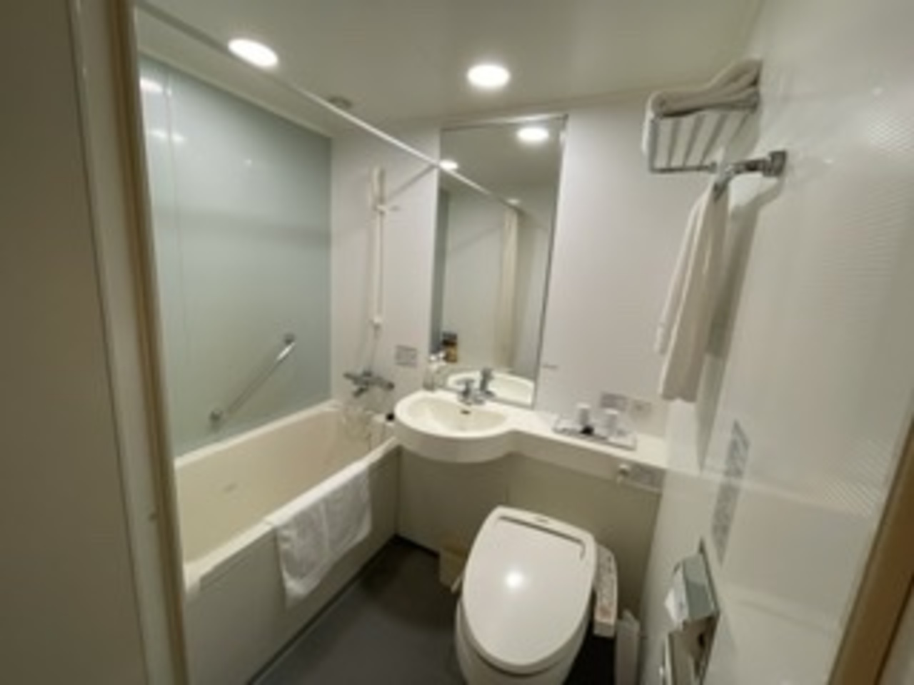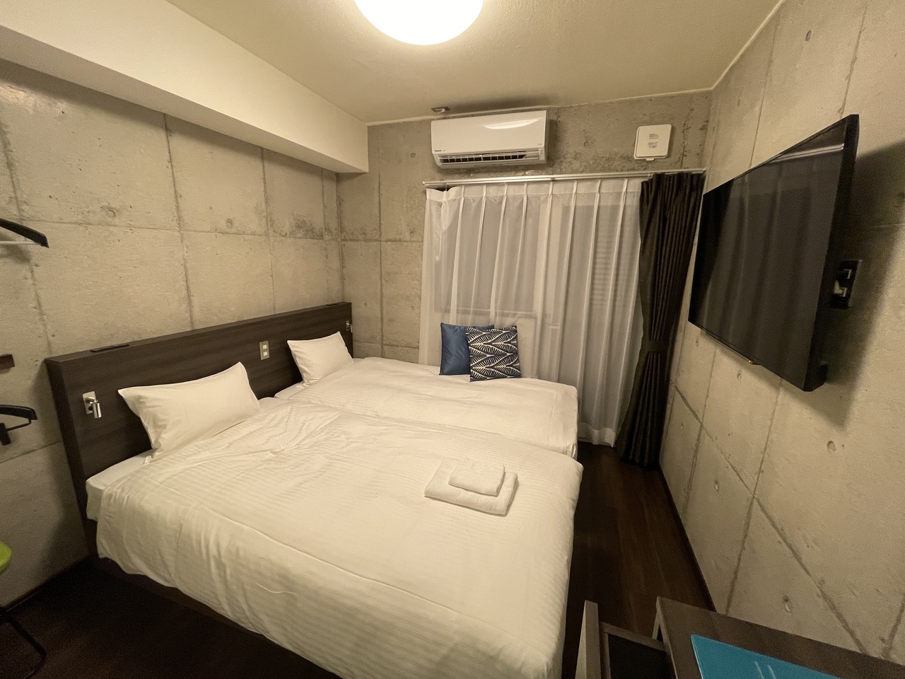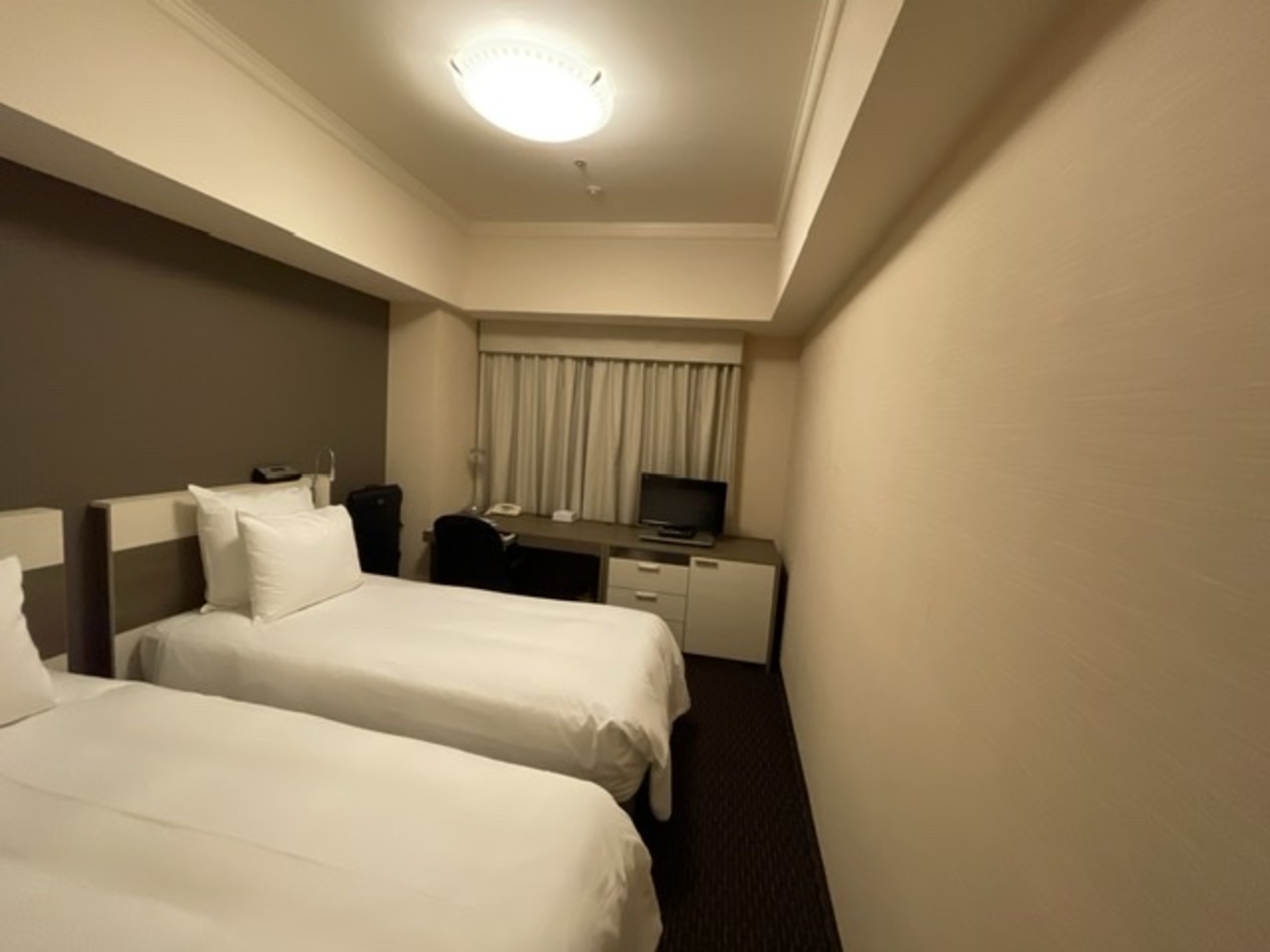 1人利用でしたが予約が取れずにツインルームを予約。コーポレートレートで格安で予約できたのですが、値段相応というか、客室は普通のビジネスホテルと変わらぬ広さ。そこに強引にベッド2つ入れてあるので狭いです。ベッドは90cm幅の極めて狭いタイプで、寝返りを打つのがやっと。