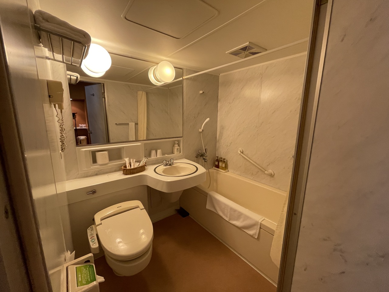 バスルームはビジネスホテルのユニットバスに比べたら広くてゆったりしているのはマル。しかしトイレは前の人の人が残っている(幸い「大」ではありませんでしたが)のはどういうことでしょう。便器蓋が閉まっていたけど掃除しなかった疑惑...
