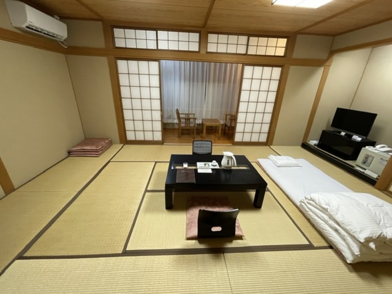 部屋はトイレ、風呂共同の広めの和室です。布団の下に敷かれたマットレスの、プラス効果が大きく、布団でもベッドに寝ているかのような感覚でした。部屋に冷蔵庫はありませんが一階に共用の冷蔵庫有り。