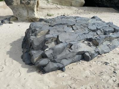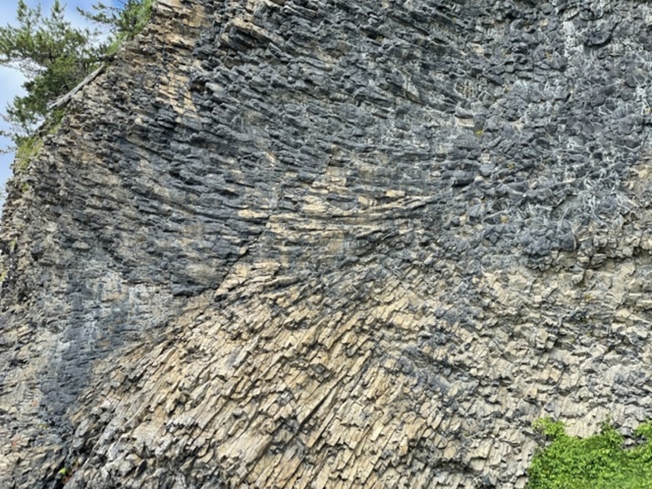 今年(2022年)はコロナのせいか海水浴場としては設定しない旨の表示がありましたが、少数の泳いでいる人はいました。ここがすごいと思ったのは駐車場から西側へ向かったところにある柱状節理。
