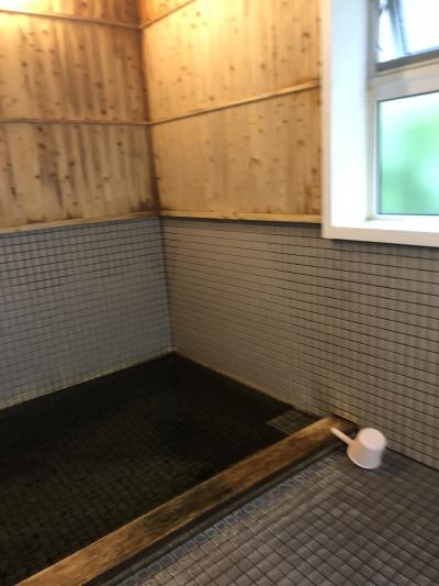 翌日はカランは2つだけ。多くの人は直接湯船から掛け湯をして入っていました。浴槽は割と大きめなヒノキ風呂で、微かに硫黄臭はするものの無色透明な、割とあっさりとしたお湯。しかしなるまで私にとっての適温ではありませんでした。長めに入るのにはこれくらいがちょうどいいのかもしれませんが...