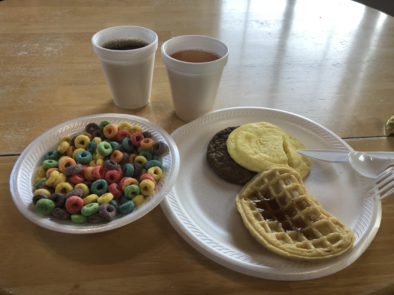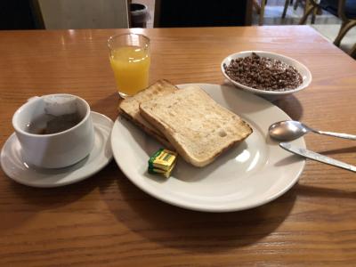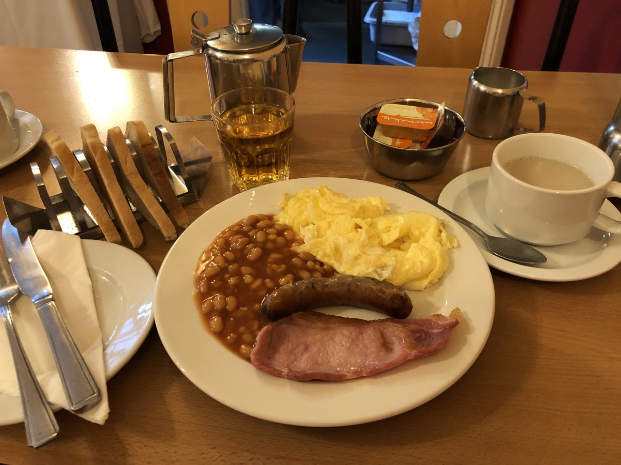 朝食は一応イングリッシュスタイルで玉子とベーコン、ベイクとビーンズが出ます。