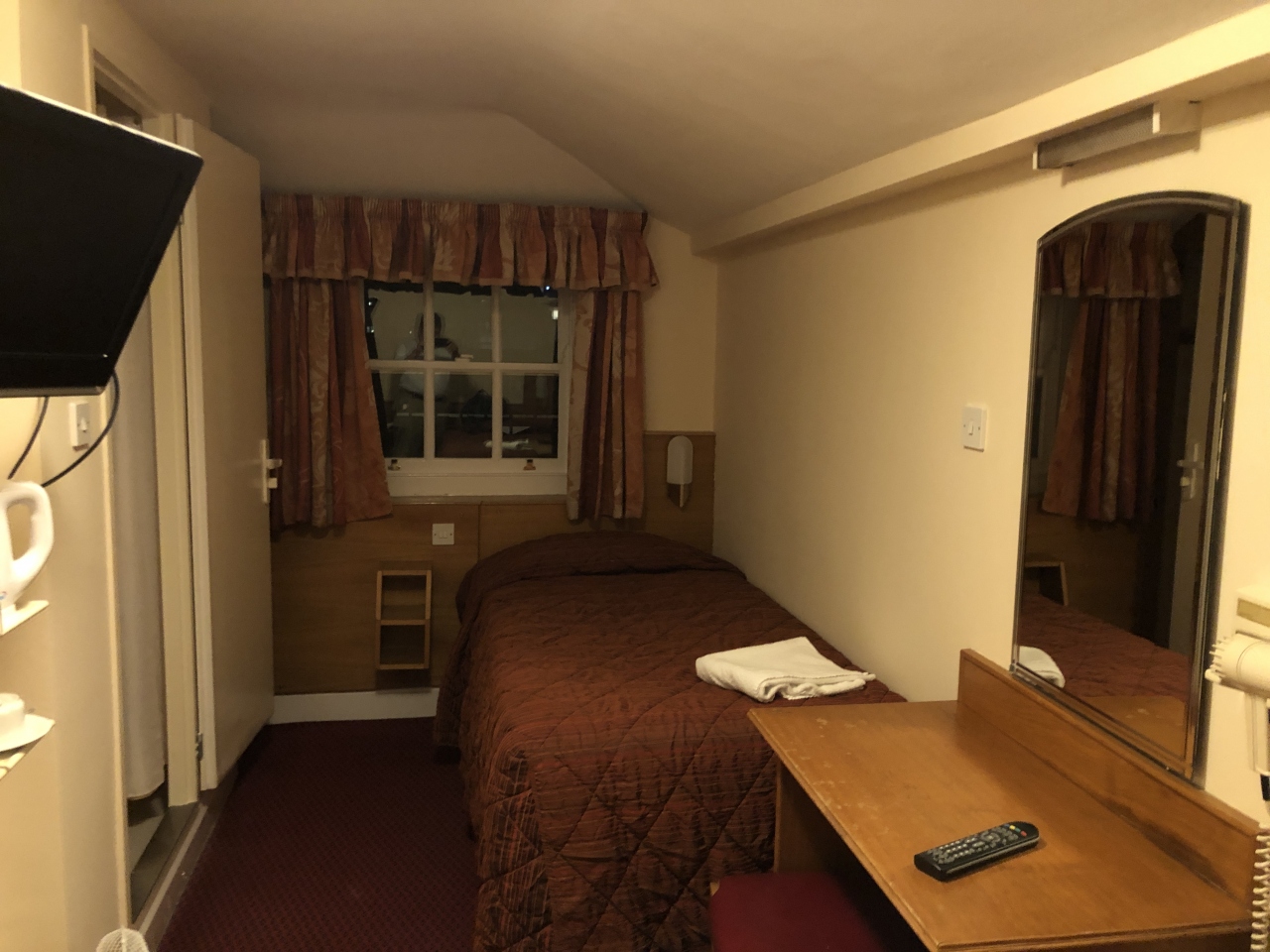 部屋はベッドは壁際にシングルベッドが二つ並んでいるのですが、列車の寝台かと思うほど、日本でも見ないような狭い幅のベッドでした。