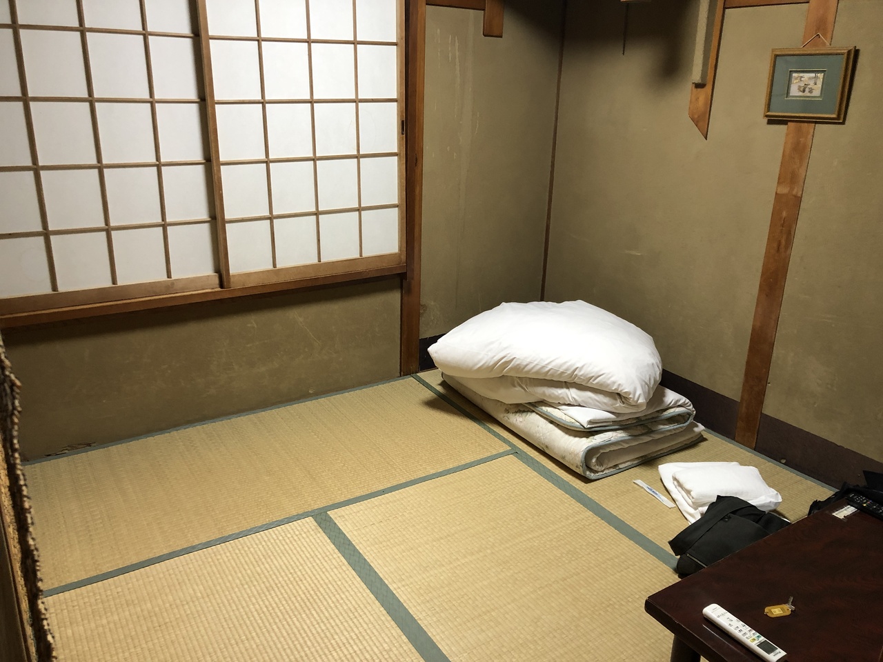 雰囲気は古き良き駅前旅館といった感じで、私的には嫌いじゃないです。部屋は畳敷で布団があるだけに等しいですが、空間はやはり広く感じます。