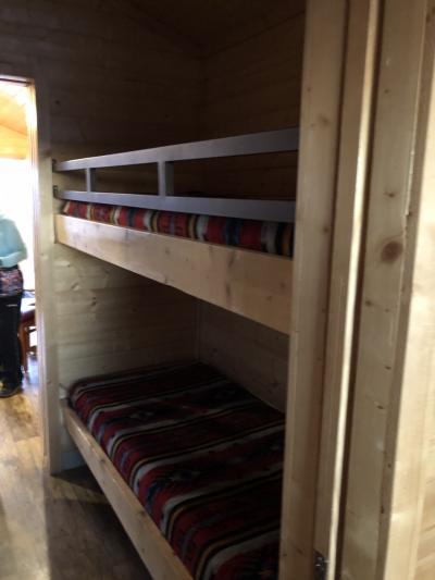 キャビンの構造がよくわからなかったのですが、モニュメントバレーの有名なミット方ビュート側に入り口があります。ドアの前にテラス、そして大きな窓にソファベッドになるソファ、中にいくに従ってテーブル、キッチン(冷蔵庫、電子レンジ、流しのみ有、食器の類はなし)、シャワー/トイレ、その正面の廊下部分に二段ベッド、そして突き当たりにダブルベッド一つが置いてあるメインベッドルームがあります。