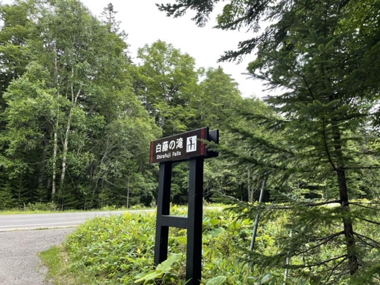 国道241号線で阿寒方面からだと川を跨いで少し行ったところ、オンネトー方面向けに距離表示板の下に小さな看板が出ています。未舗装路を結構走ったところに駐車場があり、そこからさらにトレイルを降りていきます。