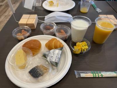 朝食はコロナ対策でビニール個別包装されたもので味気ないけど、軽朝食と謙遜している割にはボリュームたっぷりにすることもできました。