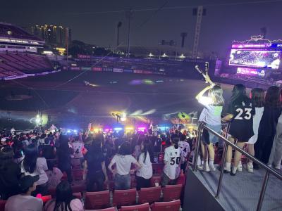 韓国プロ野球の常として、バックネット裏以外の内野エリアは応援ゾーン。スティックバルーンが禁止されたので特製のLEDの色後変わる応援グッズをみんな使っています。