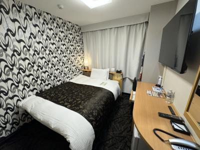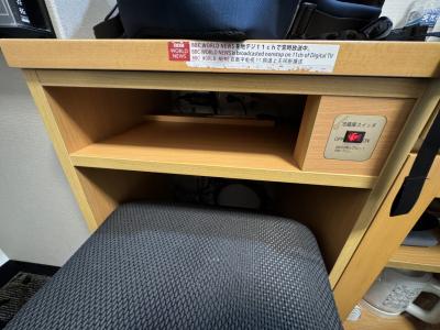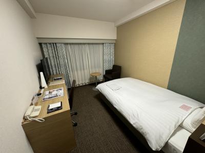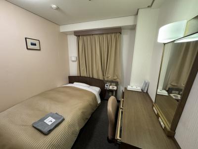 部屋はいつものアパホテルといった狭さ。ただ狭いだけならともかく、机の高さと調節できない椅子の高さが合っていなく、椅子に座った状態で机に向かうと脚を入れるスペースが有りません。椅子を引いて使うにもすぐベッドにつかえてしまいます。