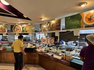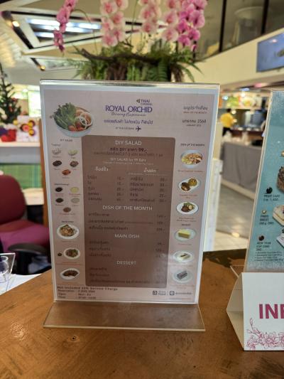 12時に着きましたがそれほど混雑していません。一応ビジネスクラスのメインが選べます。ステーキはちょっと高かったので、魚のカレー159バーツにしました。少し量が少なかったのでパッタイ99バーツとデザートを追加。