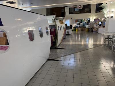 エコノミーのシートが並ぶ一角、胴体の一部などがあって気分が上がります。係員がいて観光客には案内してくれ注文をメモしてくれて飲み物のレジでまとめて支払うスタイルです。