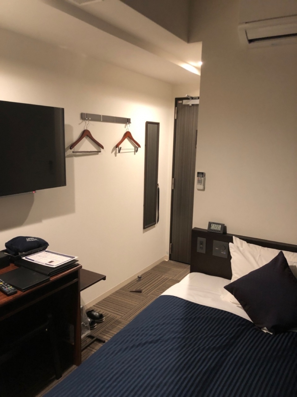 日本橋駅近くだが静かなエリアの中のメインストリートという立地はポイント高い。部屋はビジネスホテルスタンダードよりかはやや広め。小さめながらしっかりとした机と椅子があるのは嬉しい。