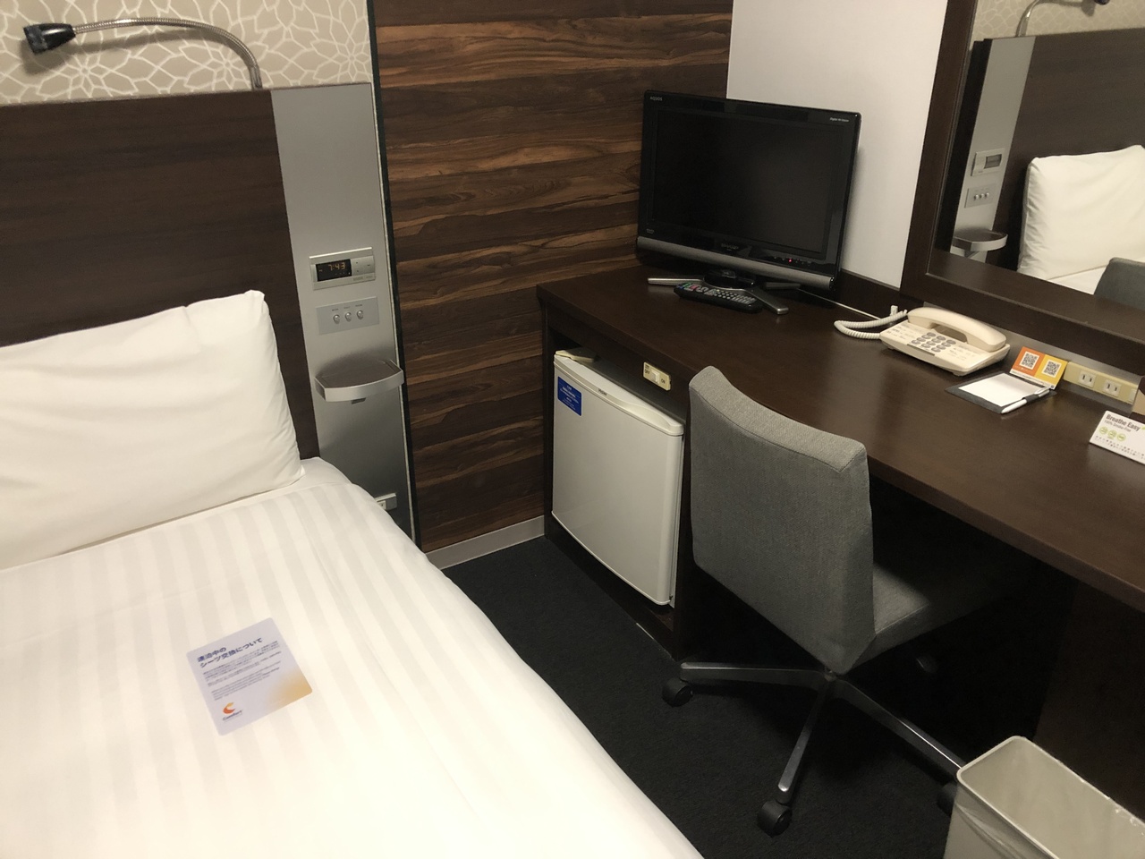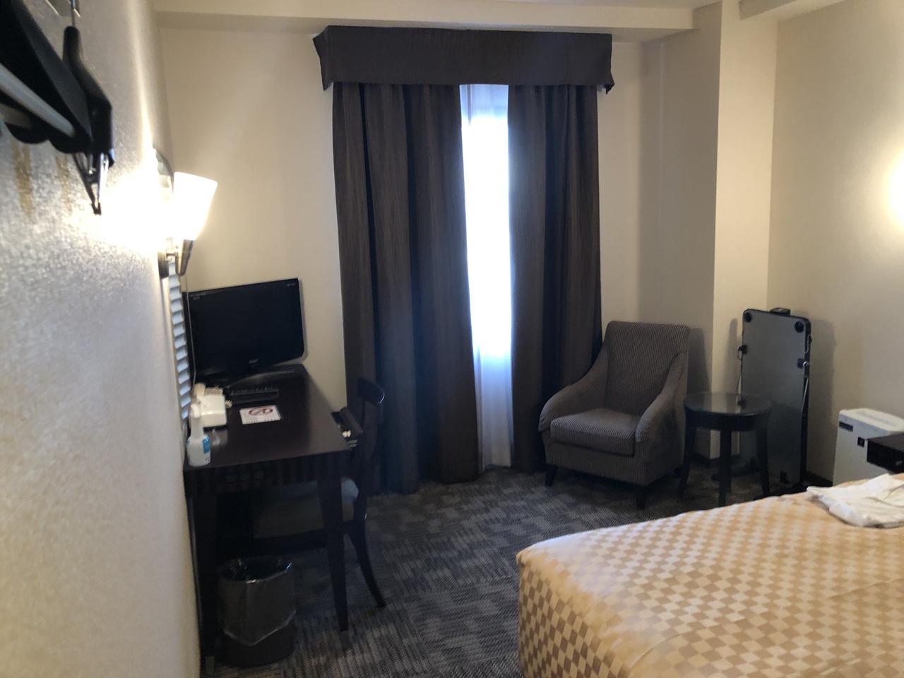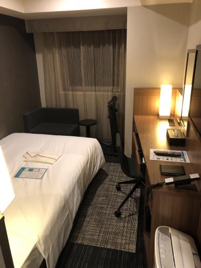 部屋はビジネスホテルとしては標準的で、ベットは寝やすかったし枕元に電源があること、椅子が座りやすかったのはポイント高し。