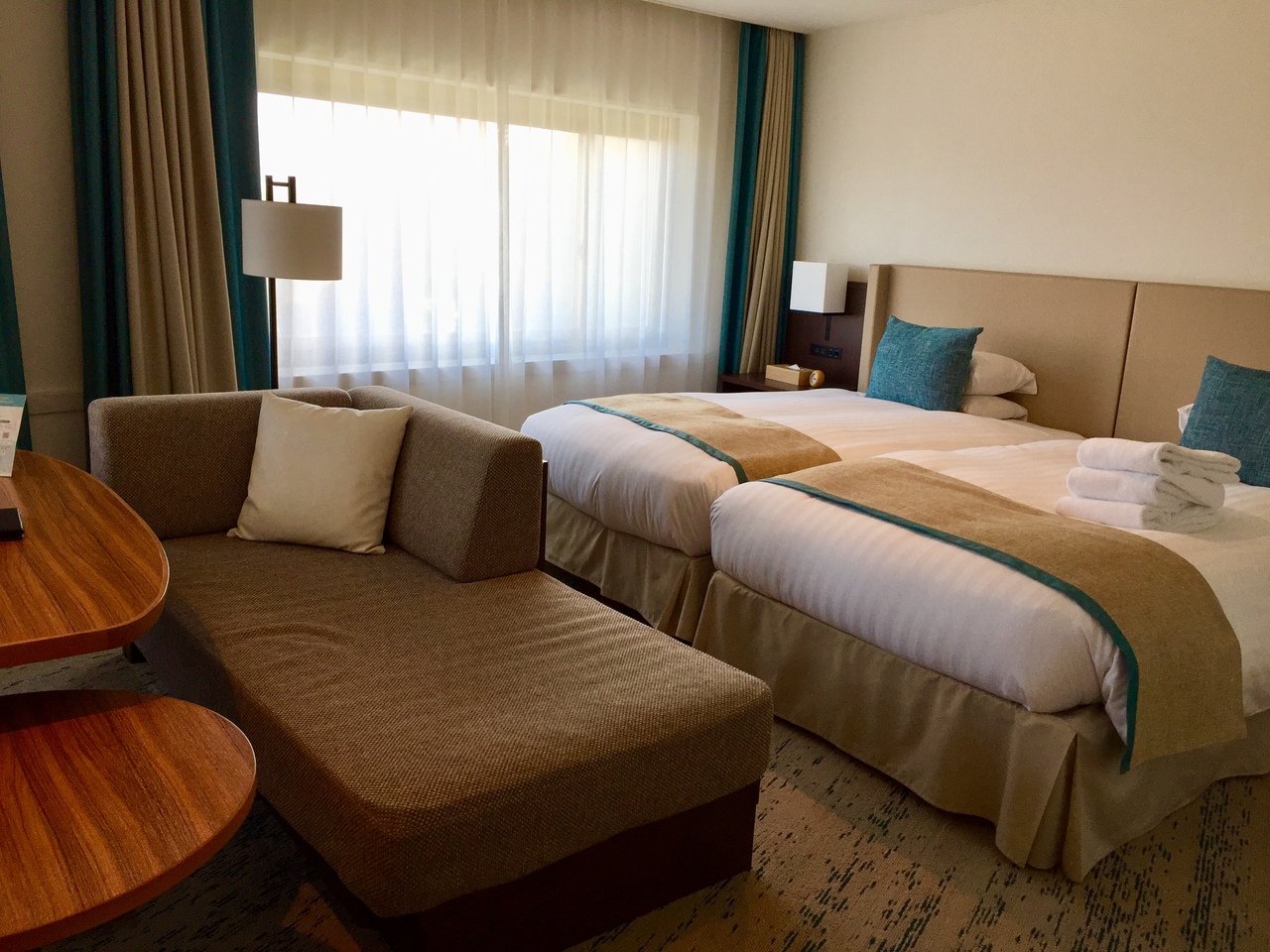 お部屋はコーラルウィングの『グランドツイン・ワイドビュールーム』。お部屋からは与那覇前浜ビーチが一望でき、最高のロケーションです。インテリアが落ち着いた色合いで、ゆったり過ごせました。