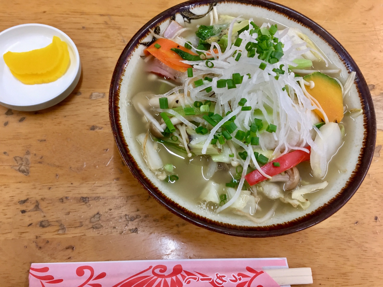 定食を食べたかったのですが、なぜかやっていないと言われて野菜ののった沖縄そばにしました。時間帯によって提供メニューが少なくなるようです。