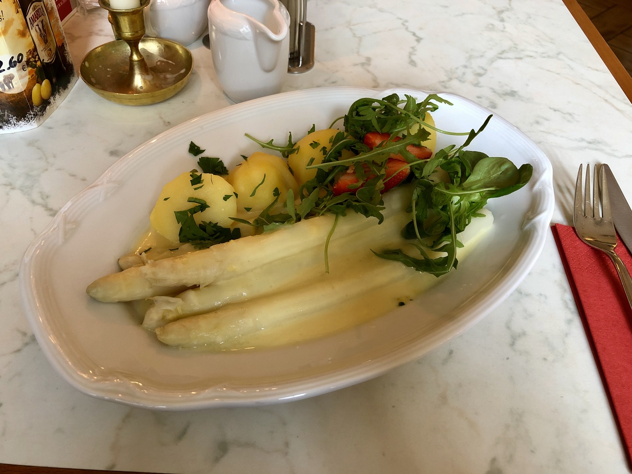 春にドイツに来たら、必ずいただこうと思っていたシュパーゲル(白アスパラ)を注文。見た目も華やかに、旬の味を楽しめました。