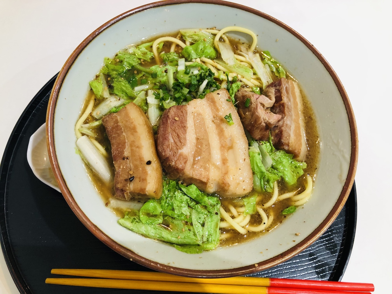 いただいたのはみそ味の三枚肉そば。食券を買って注文します。三枚肉はボリュームたっぷり!みそ味のスープはコクがありますがしつこくなく、美味しくいただきました。- 旅行時期