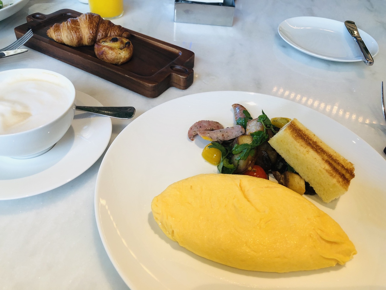 翌朝の朝食は洋食にしましたが、たいへん美味しく、ボリュームのある朝食でした。卵料理・アボカドトースト等から1品選択、他はサーモンやサラダ等の前菜とフルーツ、ヨーグルト等をスタッフの方が持ってきてくれます。