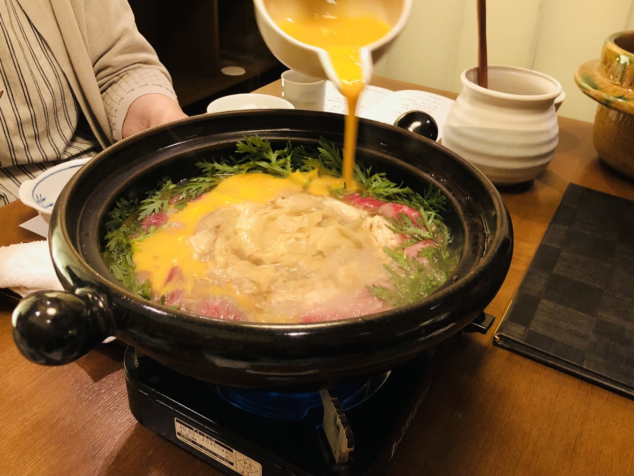 お食事はお祝いということで、特別会席の『和牛と湯波の柳川仕立て会席』にしました。和牛も湯波も柔らかく、またその他お造り等も美味しくいただきました。