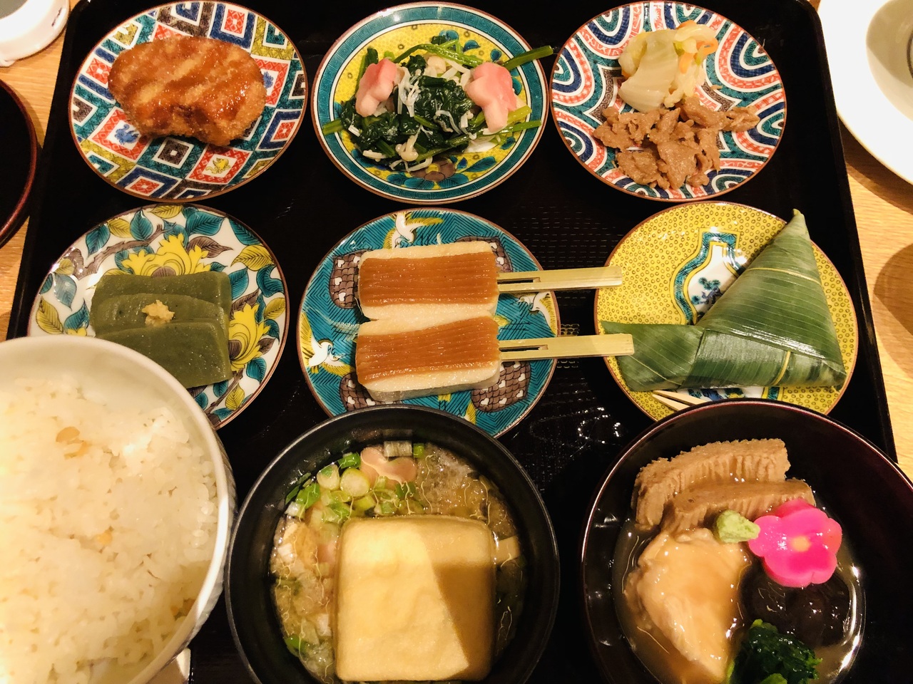 いただいたのは『加賀麩とりどり膳』。生麩田楽は2本と少なめでしたが、他にも治部煮風のものや麩饅頭等、色々な種類の加賀麩を楽しめます。同行者は『くるま麩のフレンチトースト』を頼んでいました。他にもパフェやあんみつ等、メニューは金沢のお店と同じようです。