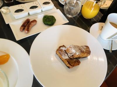 食事は近隣のアトレ竹芝や、インルームダイニングでいただきました。会員特典のルームクレジットは、インルームダイニングやホテル内のブティックのお買い物にも充当でき、朝食で利用しました。