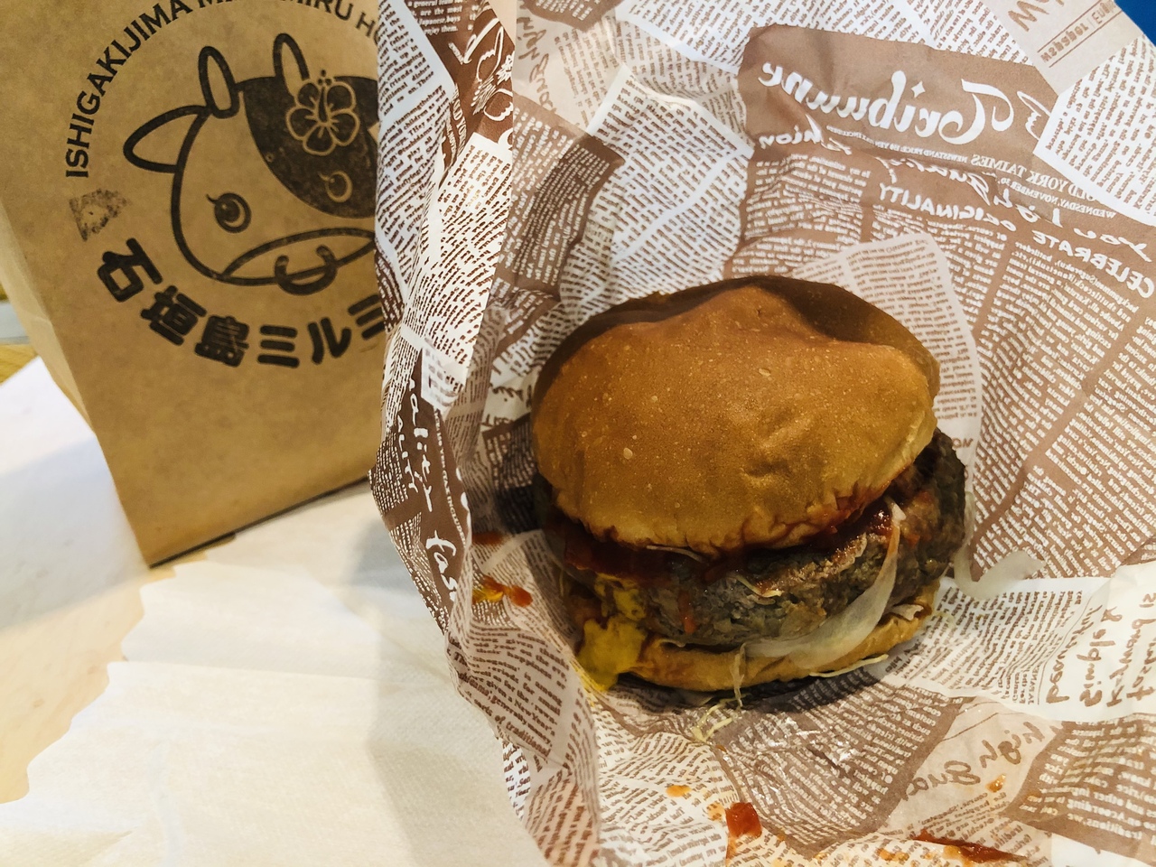 石垣発が夜の便だったので、夕食として『ミルミルバーガー』をいただきました。パティはボリュームたっぷりでふわふわのハンバーグのよう。大きいですが脂っぽくないので、美味しくいただきました。