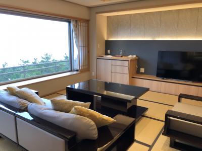 宿泊したのは『温泉半露天風呂付き和洋室』というお部屋で、2019年にリニューアルしたばかりとあってきれいなお部屋でした。広々としていて、大きな窓からは太平洋が一望。建物が海沿いではないので海からは多少距離がありますが、充分『オーシャンビュー』を楽しめます。