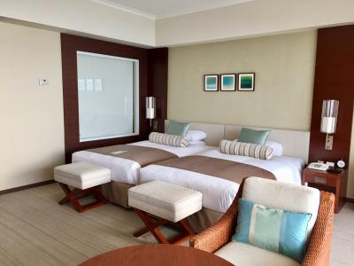 お部屋はコーラルウィングの『グランドツイン・ワイドビュールーム』。お部屋からは与那覇前浜ビーチが一望でき、最高のロケーションです。インテリアが落ち着いた色合いで、ゆったり過ごせました。
