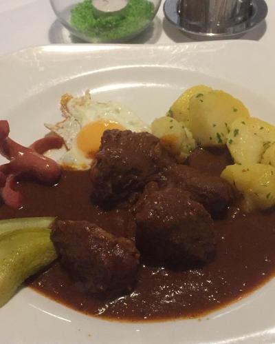 お料理は『フィアカー・グラーシュ』を注文。グラーシュはウィーンに来たら食べよう、と楽しみにしていました。お肉が柔らかくて、とても美味しかった!すごく量が多いということはありませんが、おイモは全部食べきれませんでした。