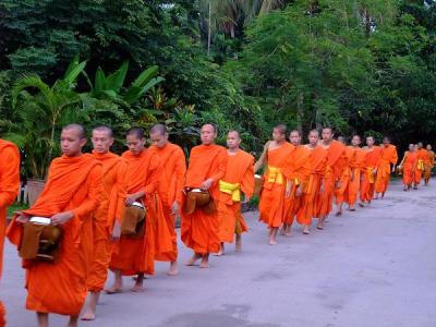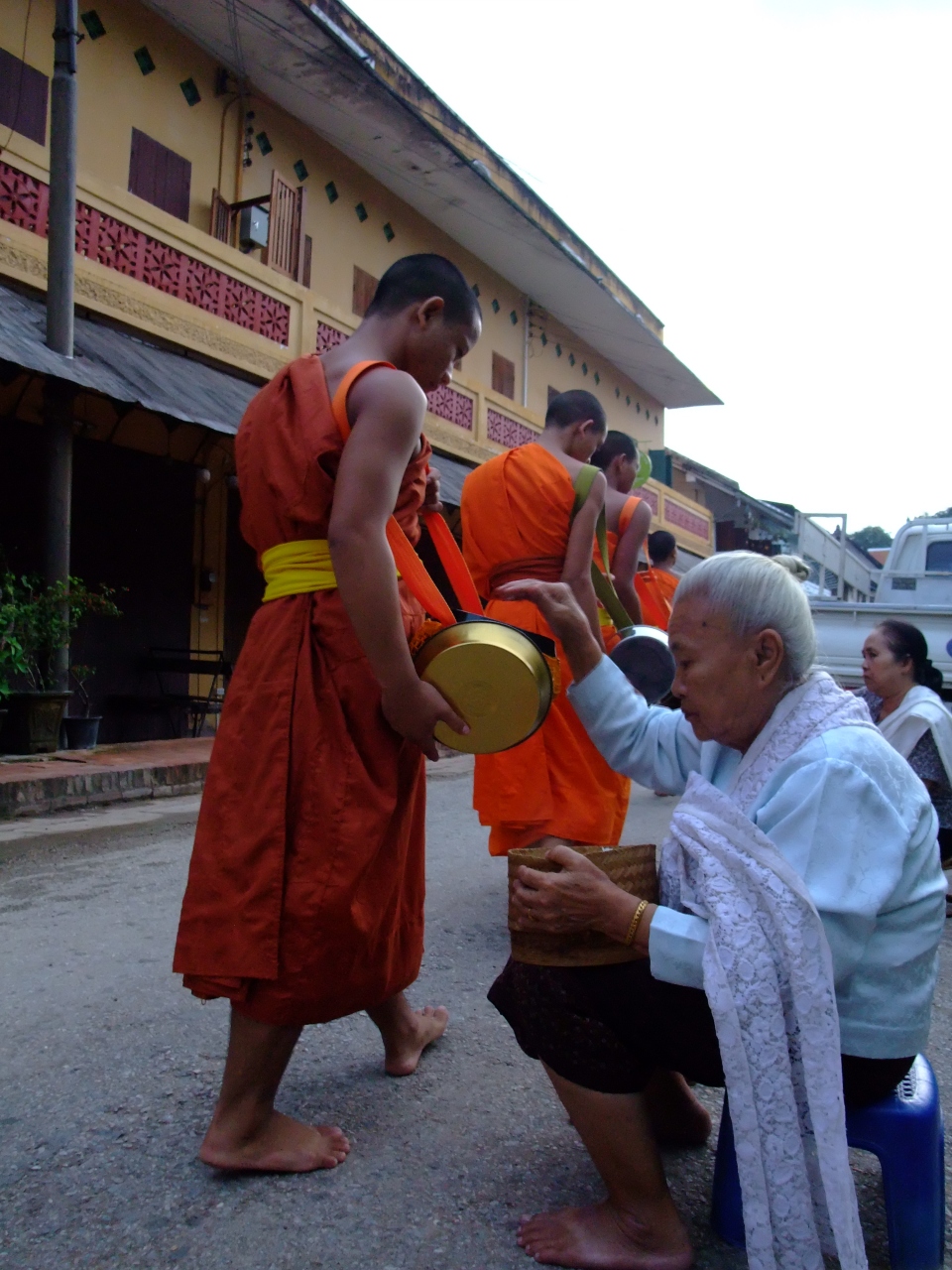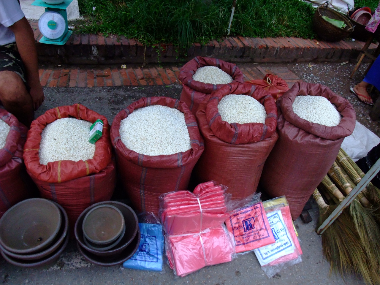 朝6時頃から托鉢は始まり、我々も喜捨用のもち米を用意しゴザの上で準備。
