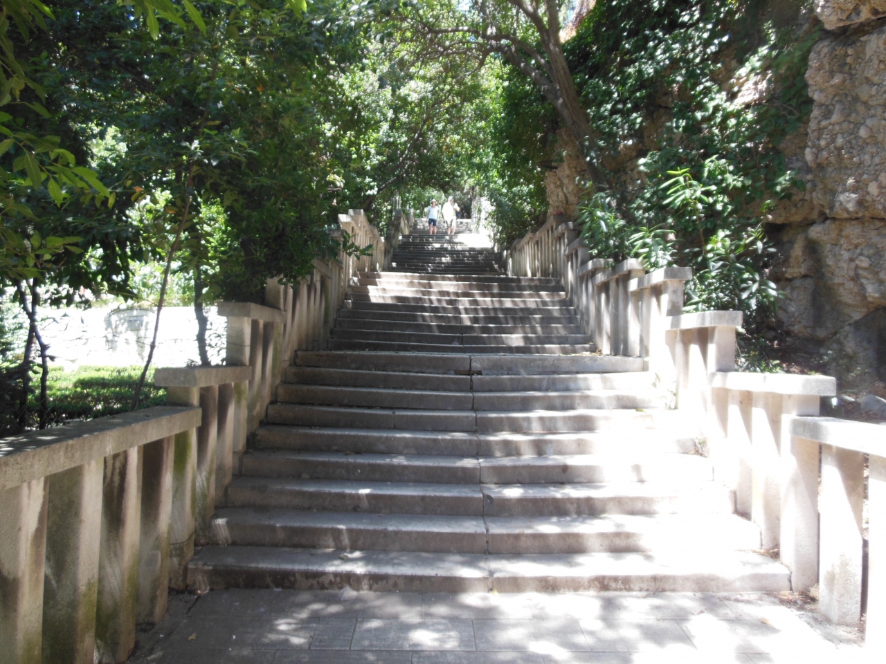 少し、スプリットで時間の余裕のある方にお薦めします。ディオクレティアヌス宮殿の鐘楼からの景色も楽しいですが、このマルヤンの丘からの景色はスプリットの全景が望めます。少し坂道ですが、宮殿の中のみでなく、海岸そして丘といった一風変わったスプリットを観光できます。小生は、遠回りの道で登ってしまいましたが、ホテル等で必ずもらえるスプリットの観光地図に従えば、海岸通りを進み、写真の矢印に従えば、しっかりした階段通りで登れます。