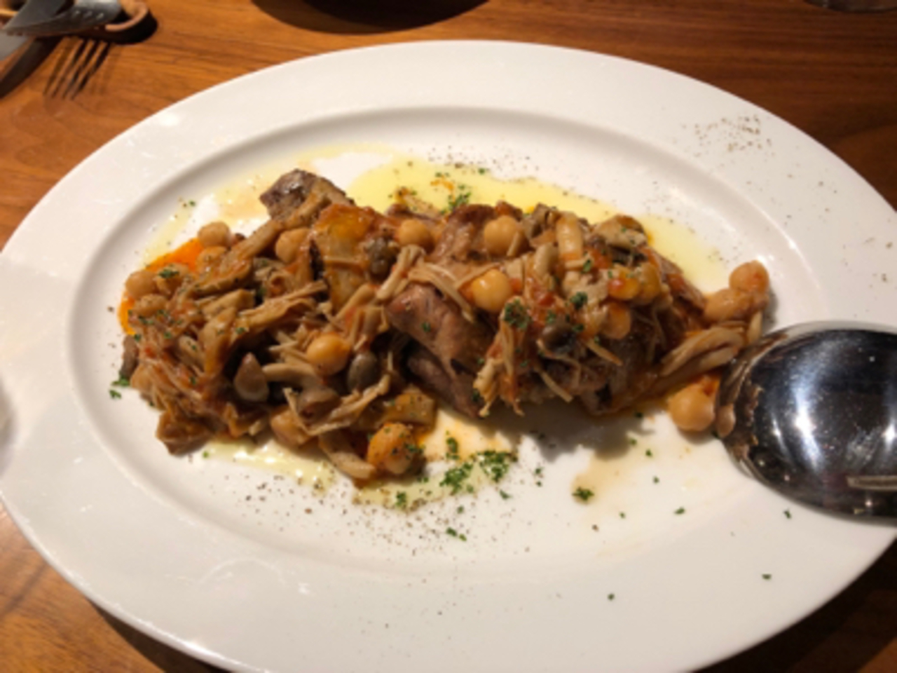 神保町から徒歩3分ほどの場所にあります。オシャレな外観に内装も木の温かみが感じられるような落ち着いた雰囲気でオープンキッチンの開放的な空間が素敵でした。ダッチオーブンを使った料理をメインにしています。ワインの種類も豊富でした。
