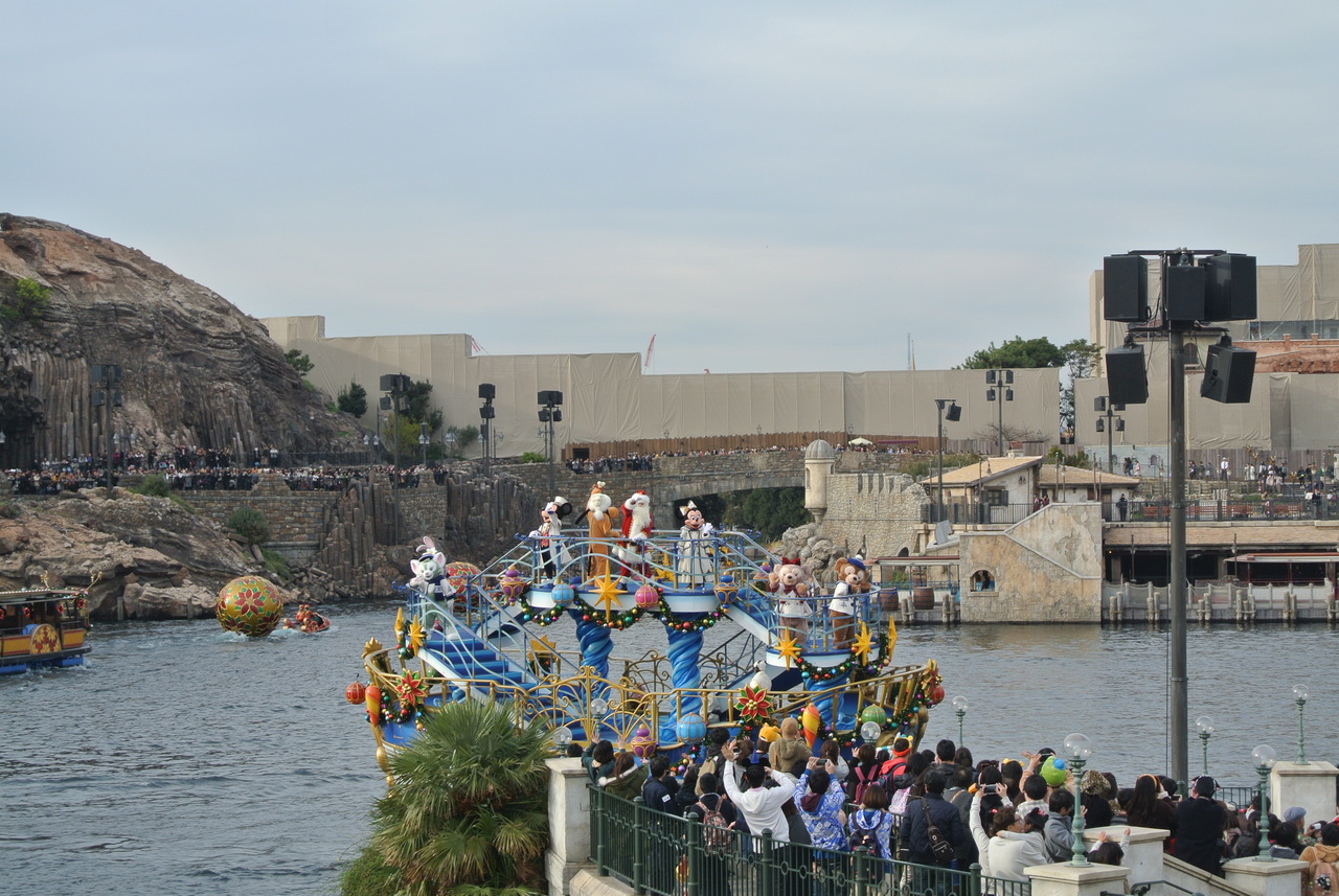 メディテレーニアンハーバーで行われる今年のディズニーシーのクリスマスイベントのショー「イッツクリスマスタイム」は残念ながら抽選制です。ほとんどのメインの観覧エリアが抽選による当選者のみの場所なのです。残念ながら外れましたので端っこが見切れる場所でしか見ることが出来ずせっかくの素敵なショーの全容がほとんど分かりませんでした。生歌でクリスマスソングのメドレーだけは楽しめました。